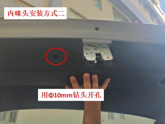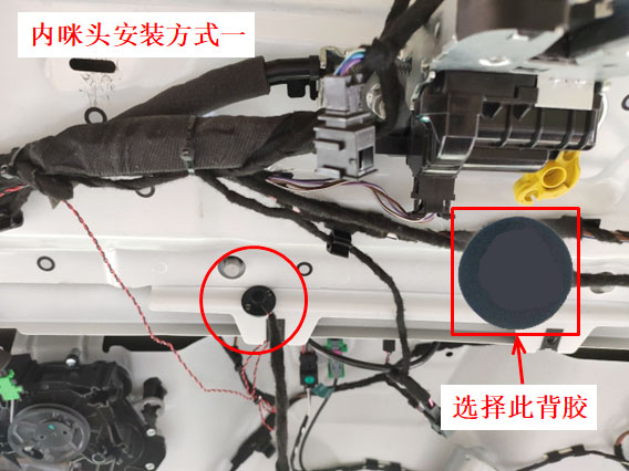 步驟1或2內(nèi)咪頭安裝方式任選一  1、內(nèi)咪頭安裝方式一:在尾門(mén)內(nèi)側(cè)選擇豎起來(lái)的鈑金位置安裝內(nèi)咪頭,使咪頭的接收面朝向車外,撕開(kāi)背膠貼在鈑金上。