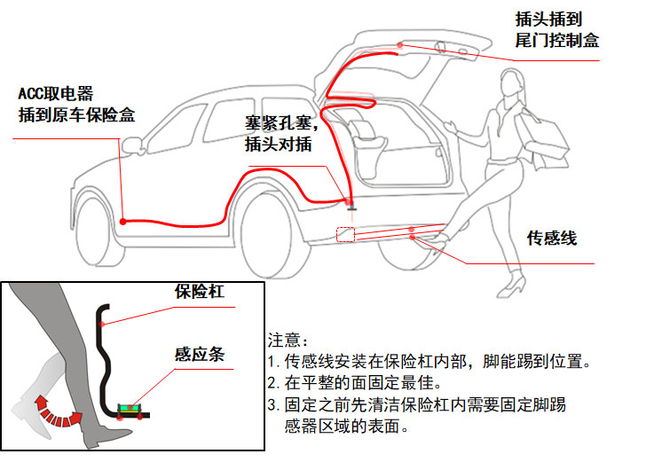 3、安裝時盡可能將其中一條感應天線靠外,增加對外部腳踢動作的感應靈敏度。