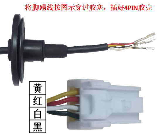 8、將腳踢的通訊線按示意圖穿過膠塞,插好4PIN膠殼。